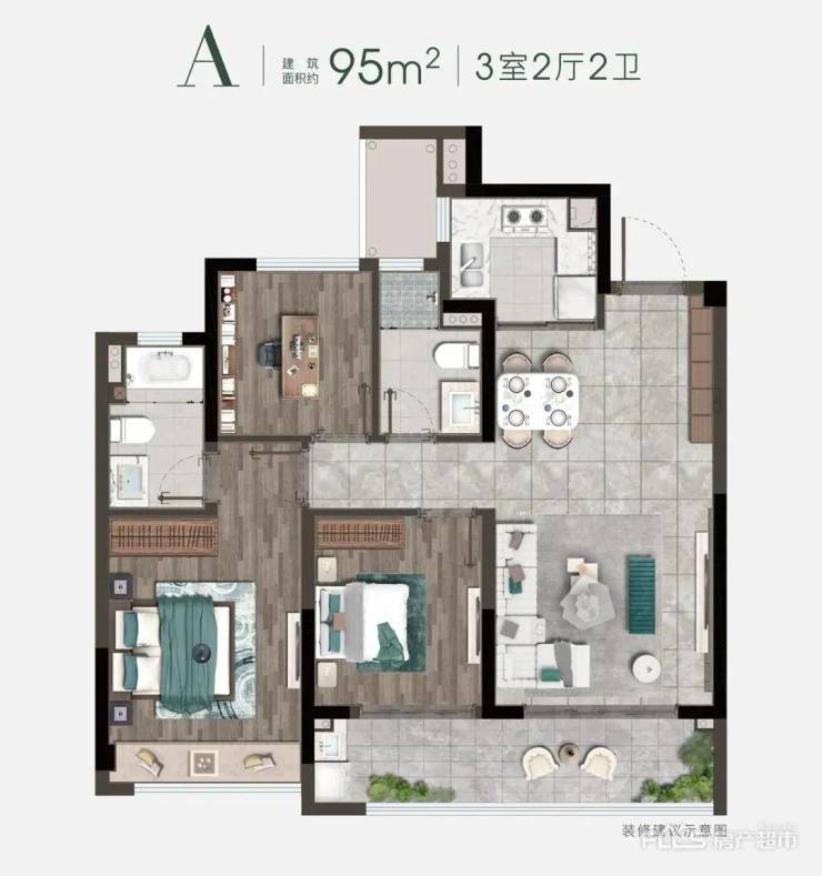 其间,建面约95㎡虽是小户型,却具有约6.4米的双联大阳台,尽可能将光影归入进来。约10米的南向宽屏采光,使阳光倾涌入室内,让一家人的日子每天沐浴在美景之中。