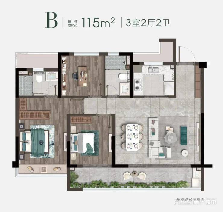 建面约115㎡,更是具有近12米南向plus采光面,约8.6米双联大阳台连通餐客大横厅和次卧,超广角采光揽景,一抬眼,四季景色宛如悬挂在窗前的高清大片,每一帧都如入画境。