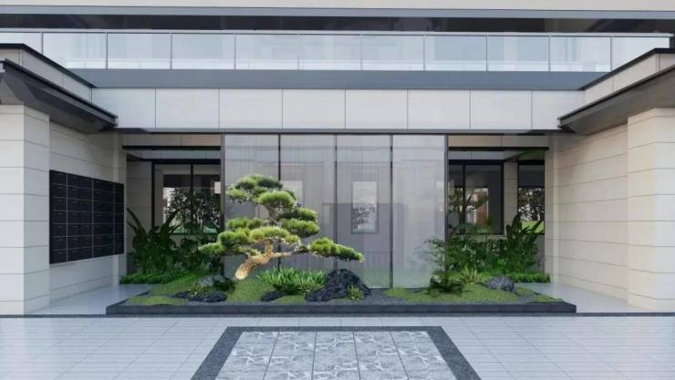 地上单元入户景墙,提高了灯火、金属格栅、花境的作用,增加了透光性更好、更有意境美的玻璃屏风,并为不同单元进口甄选不同树种,用专属的景色指引业主归家。